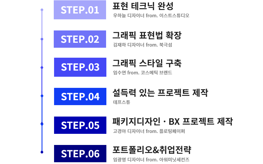 논리가 없는 디자인은 아무리 비주얼이 뛰어나더라도 기업에 좋은 인상을 남길 수 없습니다. 이번 클래스를 통해 수강생분들이 각 프로젝트에 맞게 다양한 모습으로 변모하며 작업하는 그래픽 디자이너가 될 수 있도록 저희의 경험과 작업 방식을 아낌없이 공유드리겠습니다.